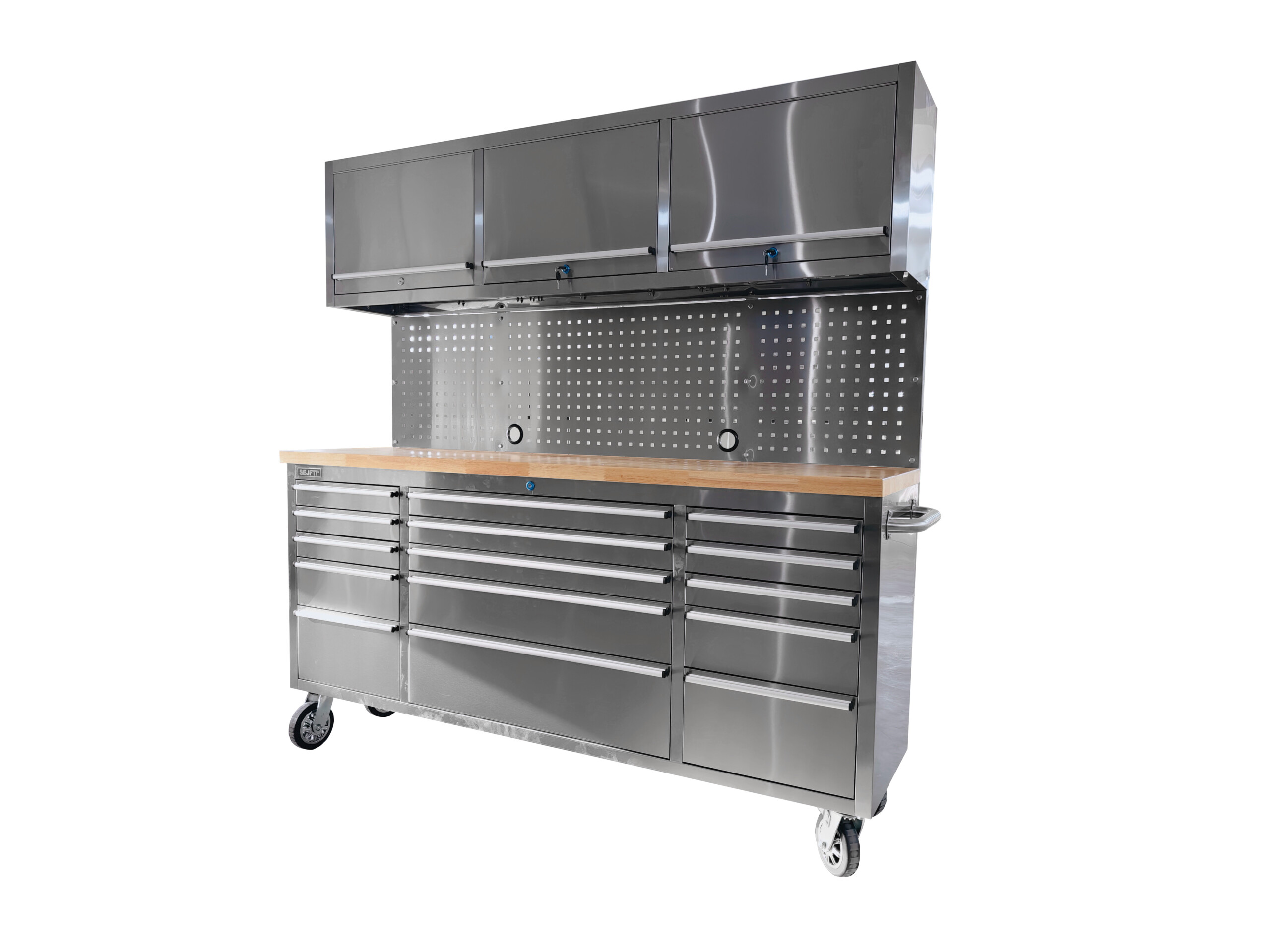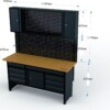 - Nad ścianą perforowaną znajdują się 3 szafki z drzwiczkami otwieranymi do góry (każda z szafek zamykana na kluczyk, który jest w zestawie)